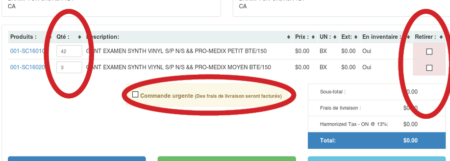 Au bas de la page, voyez le total de la commande avec les taxes. À cet endroit, vous pouvez modifier les quantités à commander ou retirer des produits de votre commande.