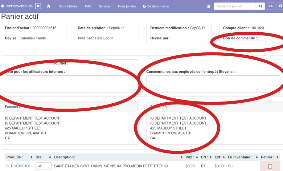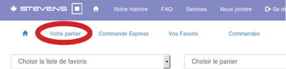 Le bouton Soumettre le panier permet de signaler que le panier est complet et sera soumis pour traitement et livraison par les employés Stevens. Si votre compte nécessite une approbation, le panier sera envoyé au responsable du compte avant de poursuivre.