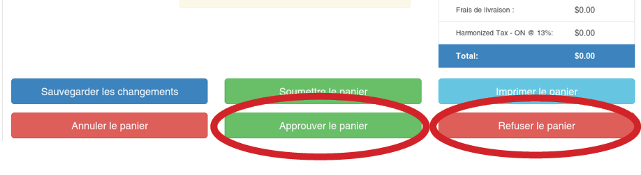 Si vous êtes l’utilisateur qui devez autoriser le panier, vous pouvez utiliser les boutons Approuver le panier et Refuser le panier. En cliquant sur Approuver le panier, vous soumettrez automatiquement la commande aux employés Stevens pour le traitement et la livraison de la commande. En cliquant sur refuser le panier, le panier sera retourné à la personne qui a demandé l’approbation.